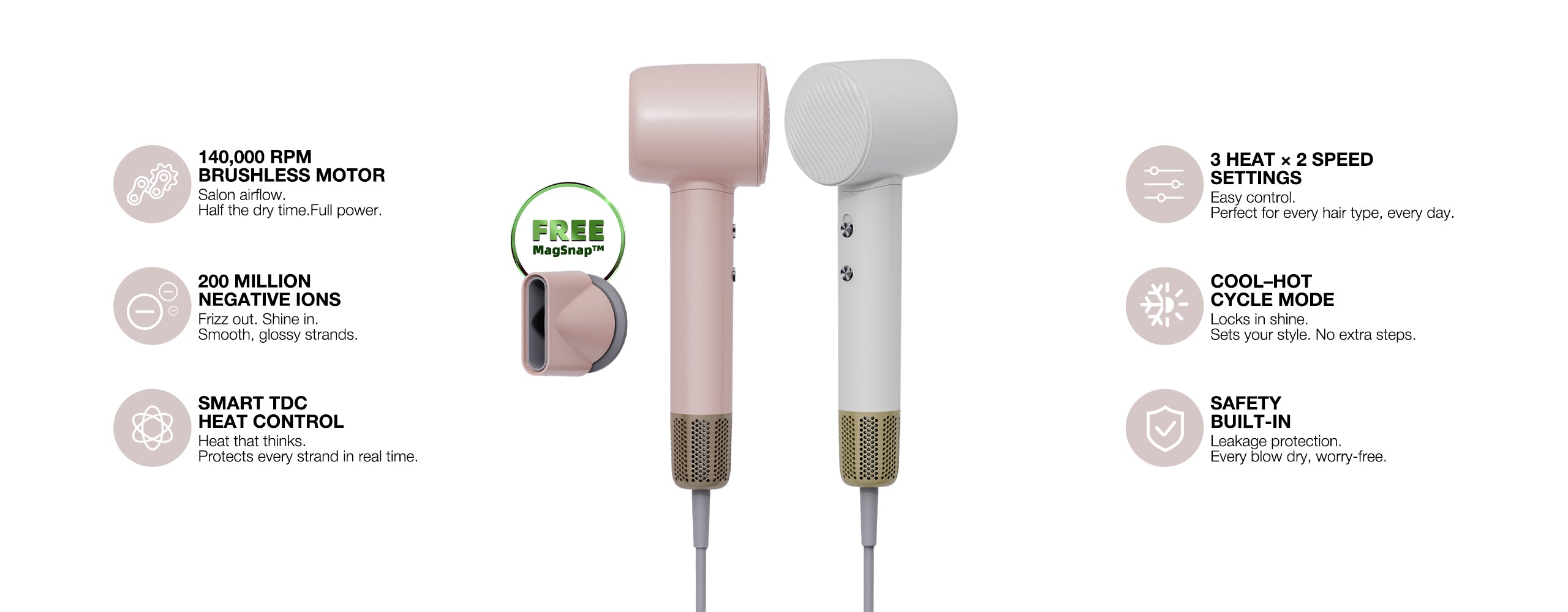 Our ionic blow dryer releases 200M ions/cm³ to neutralize static, smooth frizz, lock in moisture, and restore soft, shiny, healthy-looking hair.